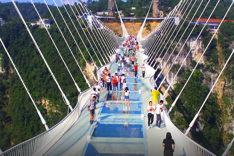 玻璃棧道,是天門山內(nèi)的精華特色游道。西線棧道全長60米,先運營;東線棧道全長150米,后運營。棧道都建在懸崖峭壁上,道路全部用透明玻璃建成,走在上面,看到腳下的萬丈深谷,膽戰(zhàn)心驚之余,感受凌空行走的快樂。 在天氣比較惡劣時,比如下雨,玻璃棧道將被關閉運營。